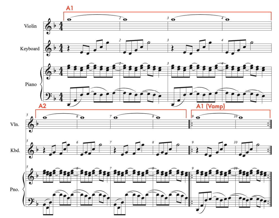 Ultimately, having gone on a journey from a place of rest in A1 to a place of tension in A2, we return to a place of rest in a shortened version of the A1 section. We can call it “A1 (Vamp)” because it is written to repeat until the scene change is finished and the conductor receives their cue to continue to the next song. Vamp sections are written intentionally to be loopable—that is, the end of the vamp leads seamlessly back to the beginning of the vamp. This is so we are not alerted to each new repetition, resulting in a composition that sounds coherent in performance, but can also respond and adapt in the moment to the immediate needs of the production. As soon as the scene change is completed, the conductor receives their cue to continue, and they in turn signal to the orchestra to conclude the song.