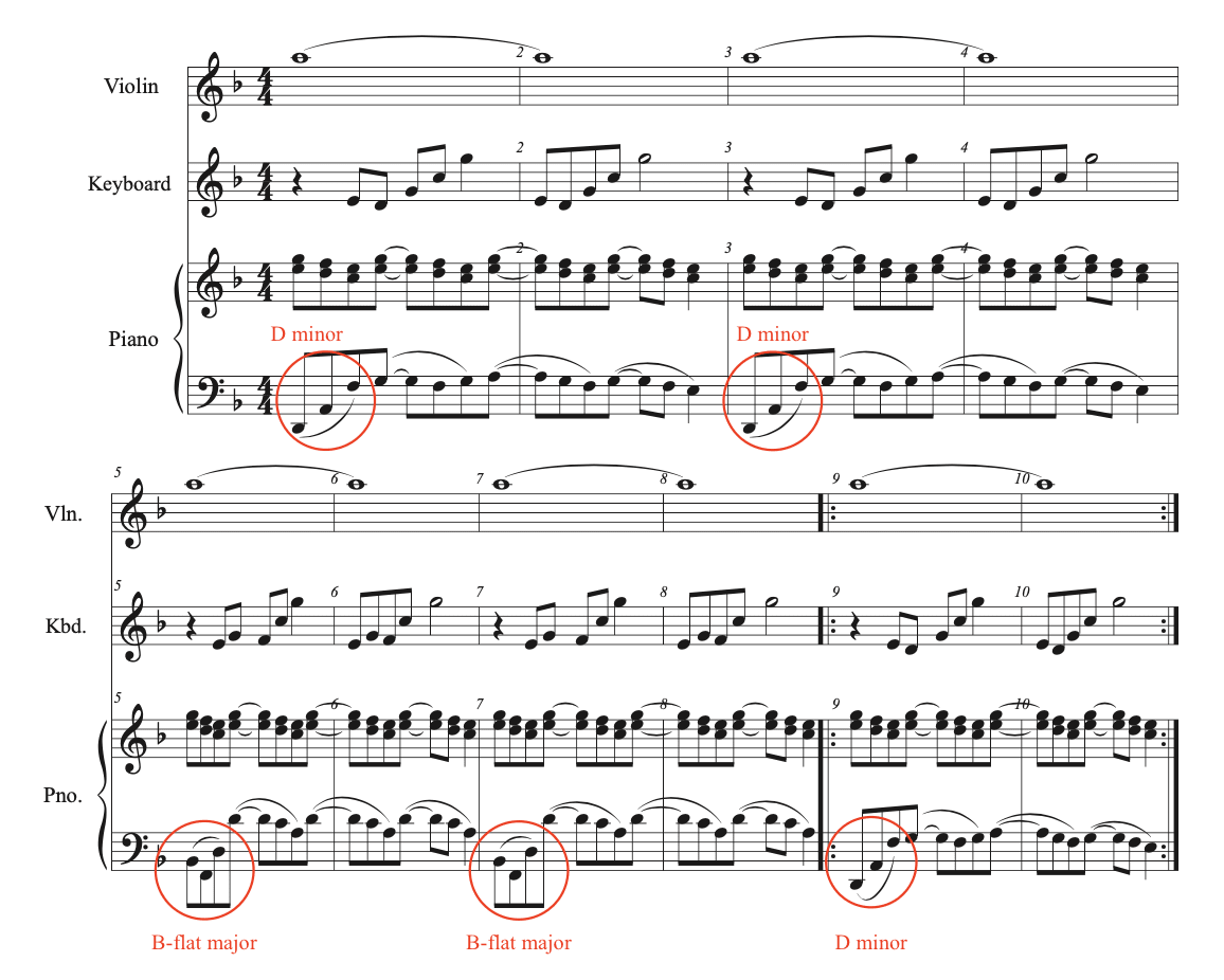 We can break this song down into three sections: A1, A2, and A1 (Vamp), annotated in figure 1 above. (You’ll notice listening to them that the A1 sections sound identical.) We can call them all A because they all contain the same component parts previously listed, just with slight variations. In figure 2 (below), we can see how in the A1 sections, the lower piano part begins by outlining a D minor chord, contextualizing those sections in a D minor sound. This lends a softer, more reflective quality to the music. In the A2 section, the lower piano part changes to outline a B-flat major chord, recontextualizing the rest of what we hear with a brighter B-flat major sound. In combination with the violin sustaining an A—a note that falls harmoniously within D minor, but that sounds very dissonant on top of a B-flat major chord—the A2 section carries quite a bit more tension than the A1 section.