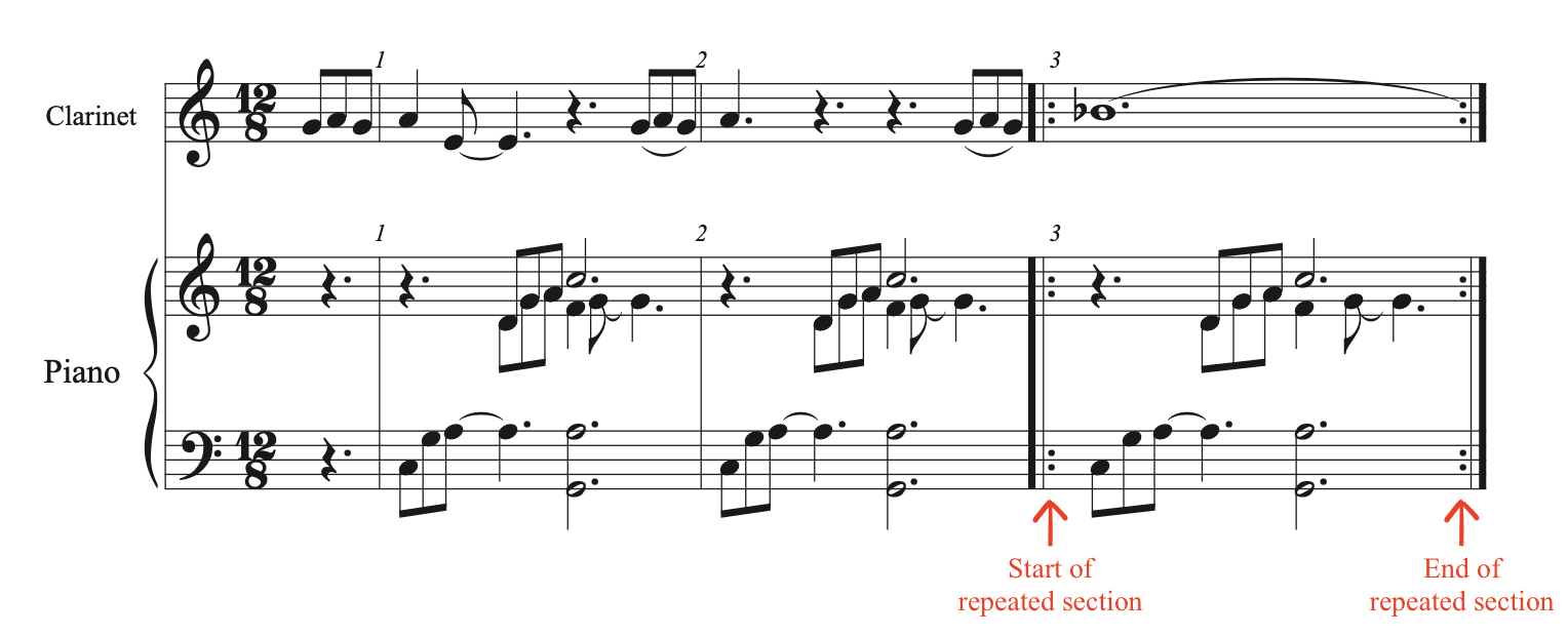This song is much shorter than the first example, consisting of just a single musical phrase. (We can gather that this scene change probably took much less time to complete than the one covered by “Scene Change to Studio.”) But it’s built similarly in that brings back musical material we’ve heard before and concludes with a vamp. In “After Children,” the vamp section (the beginning and end of a repeated section in music is signified by double dots, annotated above) is just one measure long, repeating the same accompaniment figure in the piano that appears throughout the song “Children and Art,” and holding the sustained B-flat in the clarinet. This B-flat a borrowed note outside the song’s key, so it carries an unexpected, slightly surprising quality, hanging in the air like a question. What will George do?